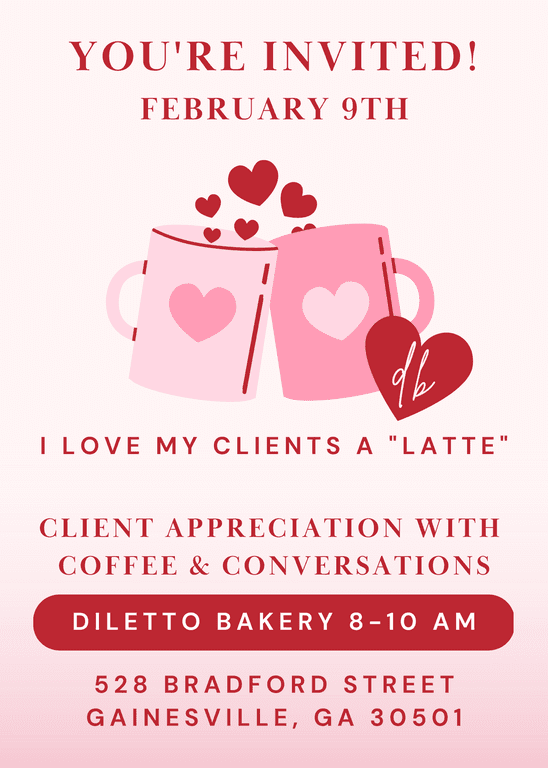 Isn’t February so fun? The cold winter is leaving us as vibrant spring blooms just around the corner. Love is in the air this month, and that includes lovin’ on my clients! Please join me for my February client appreciation event. This will be a great time to catch up and support one of my favorite sweet spots in Gainesville, on the outskirts of the ever-growing Midland area.